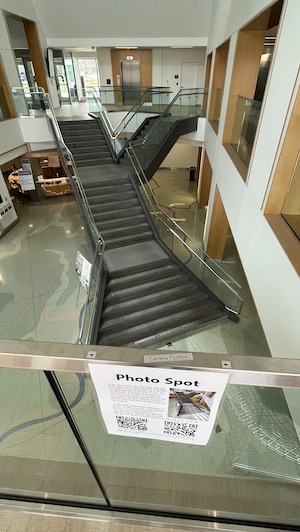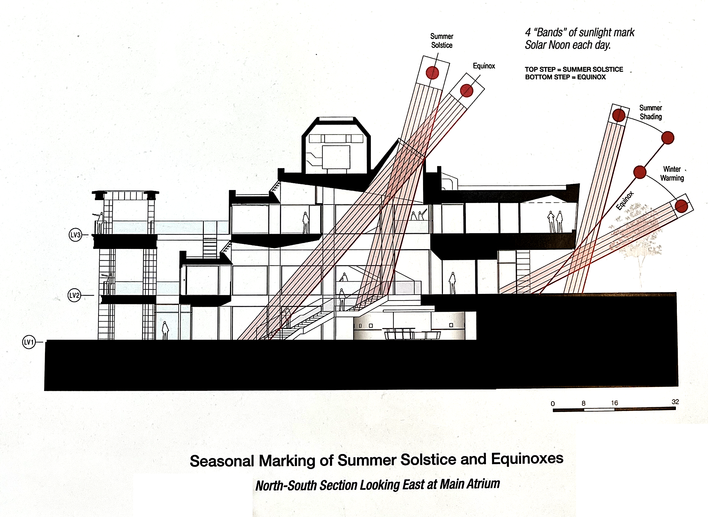 When Wooster Hall at SUNY New Paltz was remodeled (2014-2016), architect Randy Croxton and his colleagues at Croxton Collaborative Architects, P.C. added a three-story atrium with a staircase which is perfectly aligned in the north-south direction, along with skylights that illuminate part of the staircase each day at solar noon. Depending on the season, the high sun of summer lights the upper staircase, while at the vernal and autumnal equinoxes the base of the stairs is brightened and the shadows align perfectly with markings on the floor.