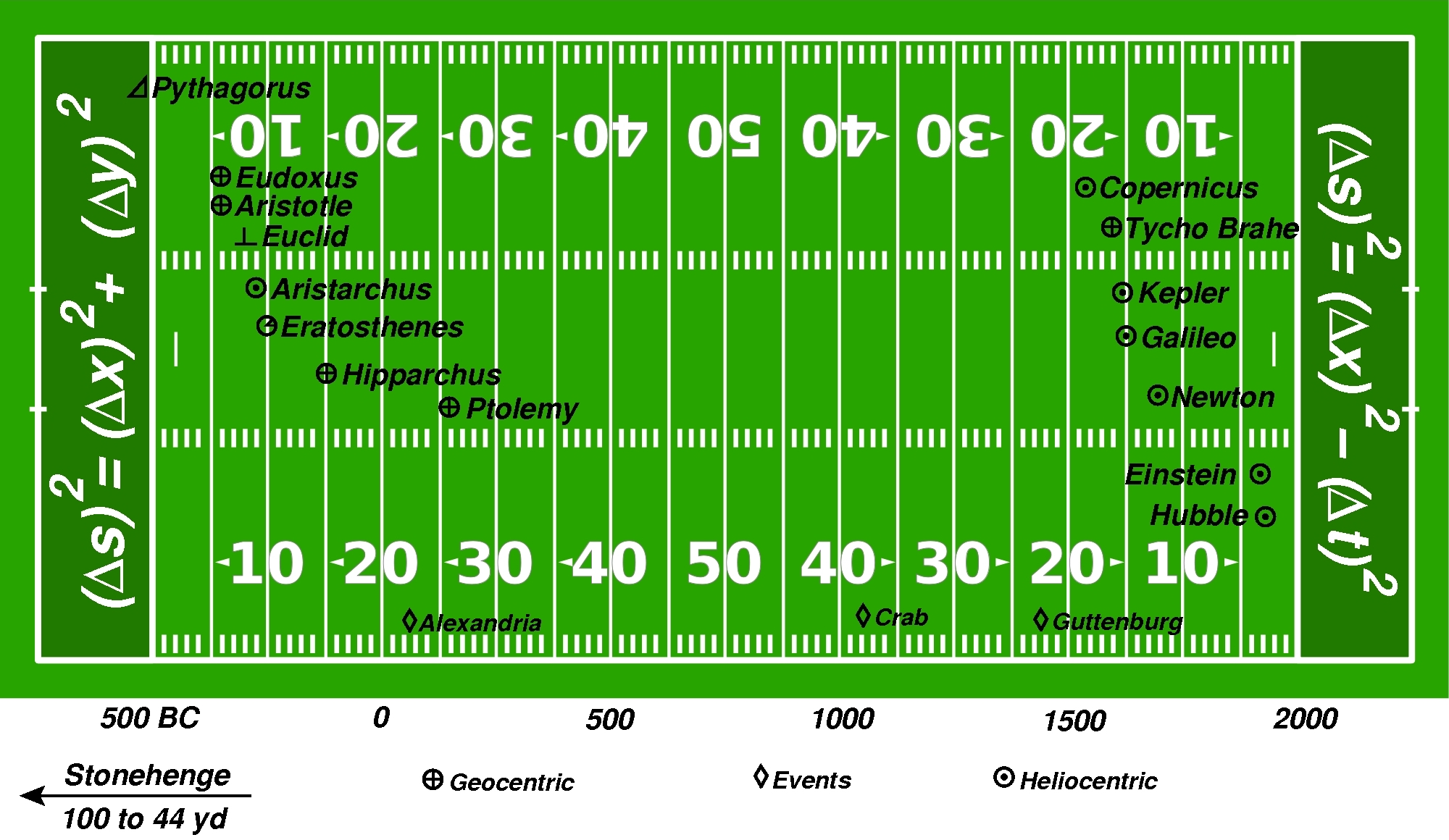 Example: the Crab Nebula was created by a supernova which was observed in 1054 AD. The distance from the left-side goal line is L = (1054+500)/25=1554/25= 62 yards, which is the 38 yard line on the right side of the field.